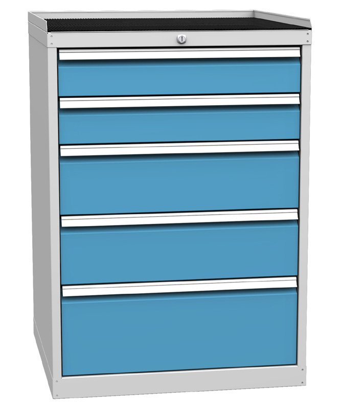 Päťzásuvková dielenská skriňa, šírka 720, výška 1030, hĺbka 700 mm.Výsuv zásuviek 80%, nosnosť zásuviek 80 kg. centrálny zámok. 2x zásuvka 120, 2x 180, 1x 240 mm. Farba korpusu RAL 7035 svetlosivá.