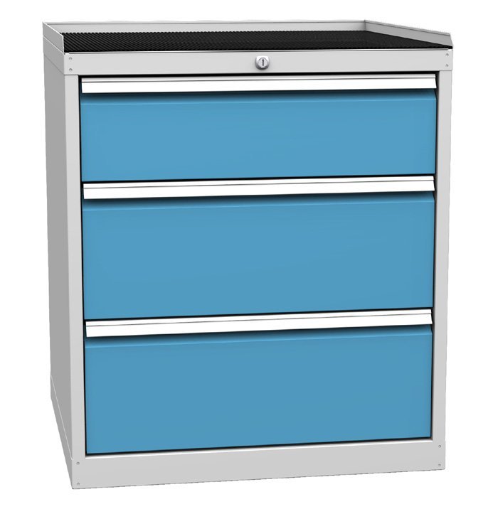 Trojzásuvková dielenská skrinka, šírka 720, výška 840, hĺbka 700 mm. Výsuv zásuviek 80%, nosnosť zásuviek 80 kg. centrálny zámok. 1x zásuvka 180, 2x 240 mm. Farba korpusu RAL 7035 svetlosivá.