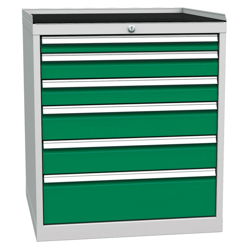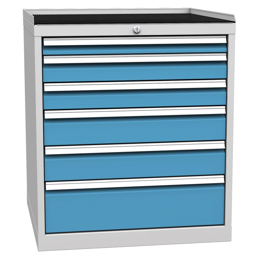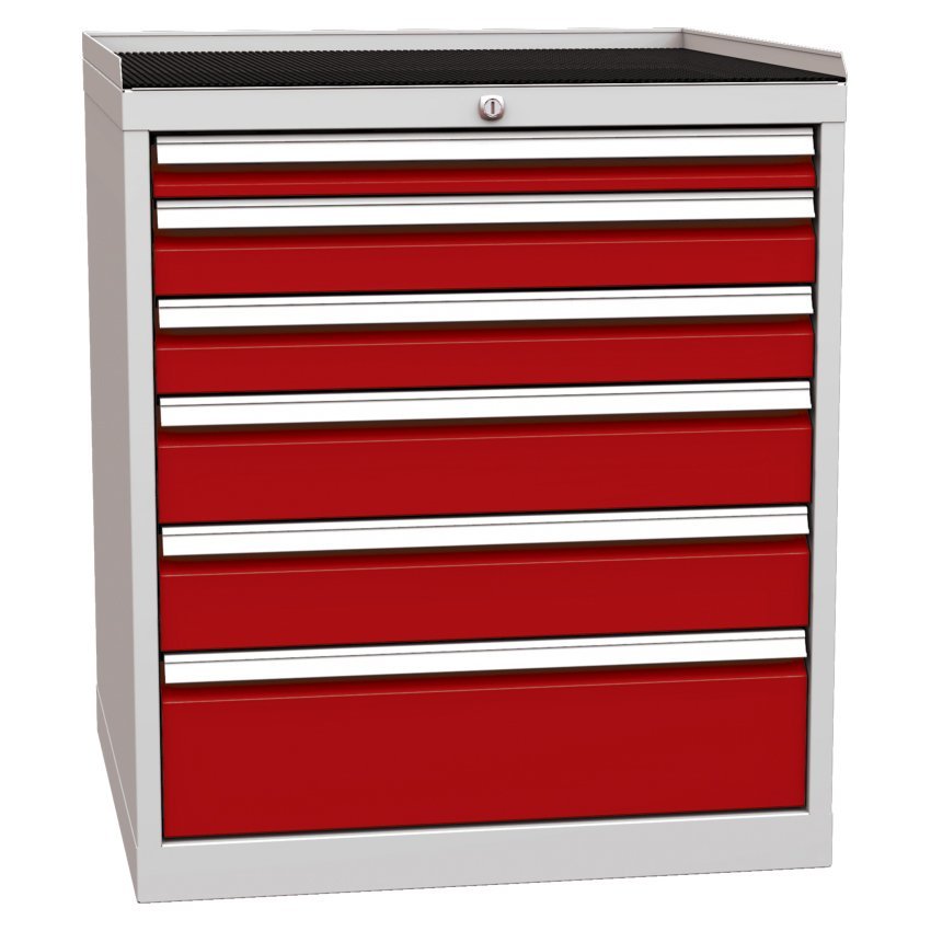 Šesťzásuvková dielenská skrinka, šírka 720, výška 840, hĺbka 700 mm. Výsuv zásuviek 80%, nosnosť zásuviek 80 kg. centrálny zámok. celý popis a parametre
