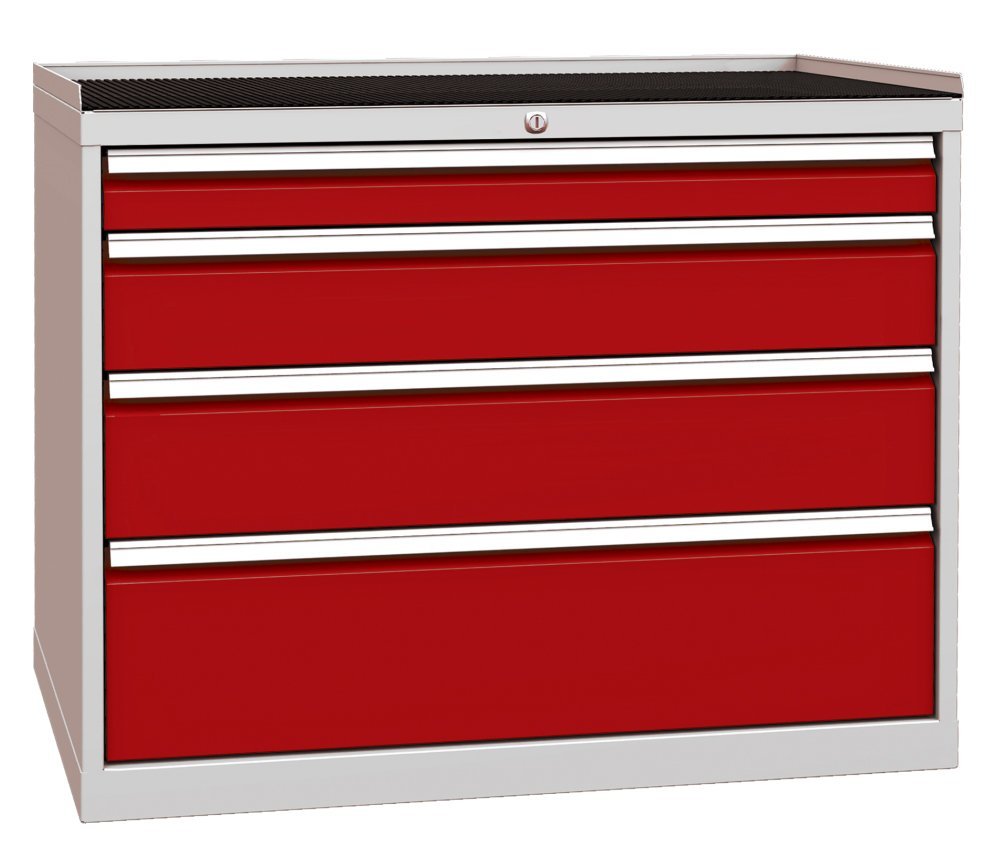 Štvorzásuvková dielenská skrinka, šírka 1000, výška 840, hĺbka 700 mm. Výsuv zásuviek 80%, nosnosť zásuviek 80 kg. centrálny zámok. 1x zásuvka 90, 1x 150, 1x 180, 1x 240 mm. Farba korpusu RAL 7035 svetlosivá.