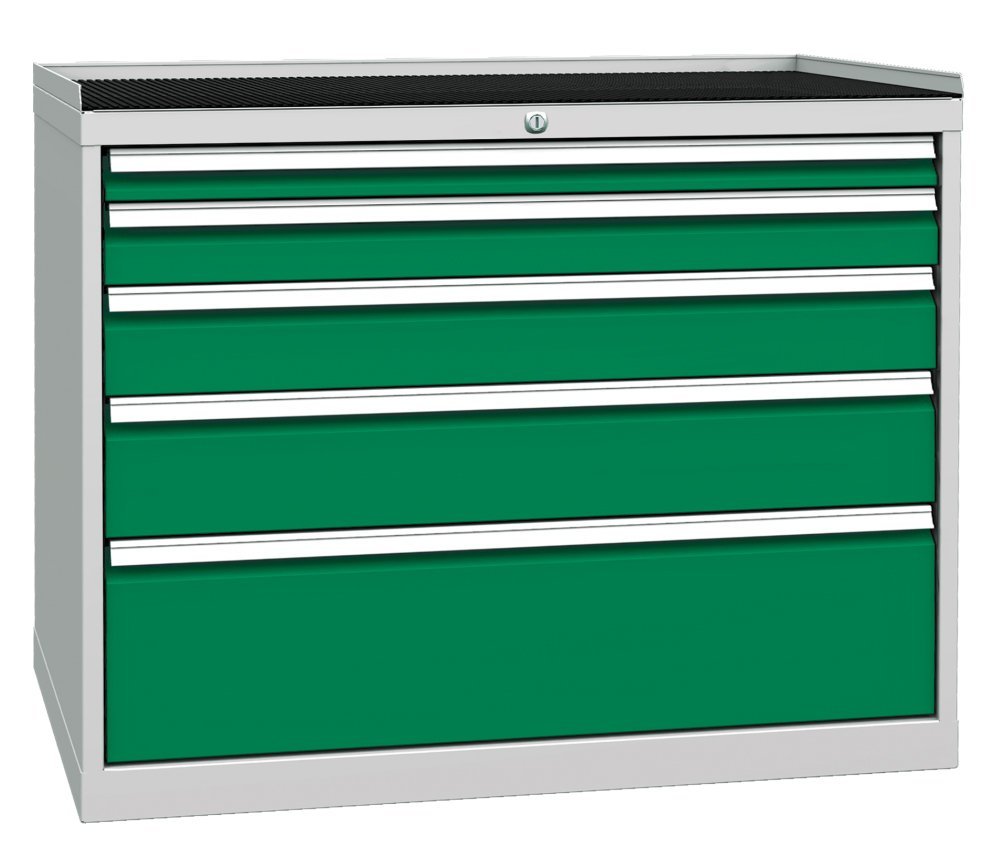Päťzásuvková dielenská skrinka, šírka 1000, výška 840, hĺbka 700 mm. Výsuv zásuviek 80%, nosnosť zásuviek 80 kg. centrálny zámok. 1x zásuvka 60, 1x 90, 1x 120, 1x 150, 1x 240 mm. Farba korpusu RAL 7035 svetlosivá.