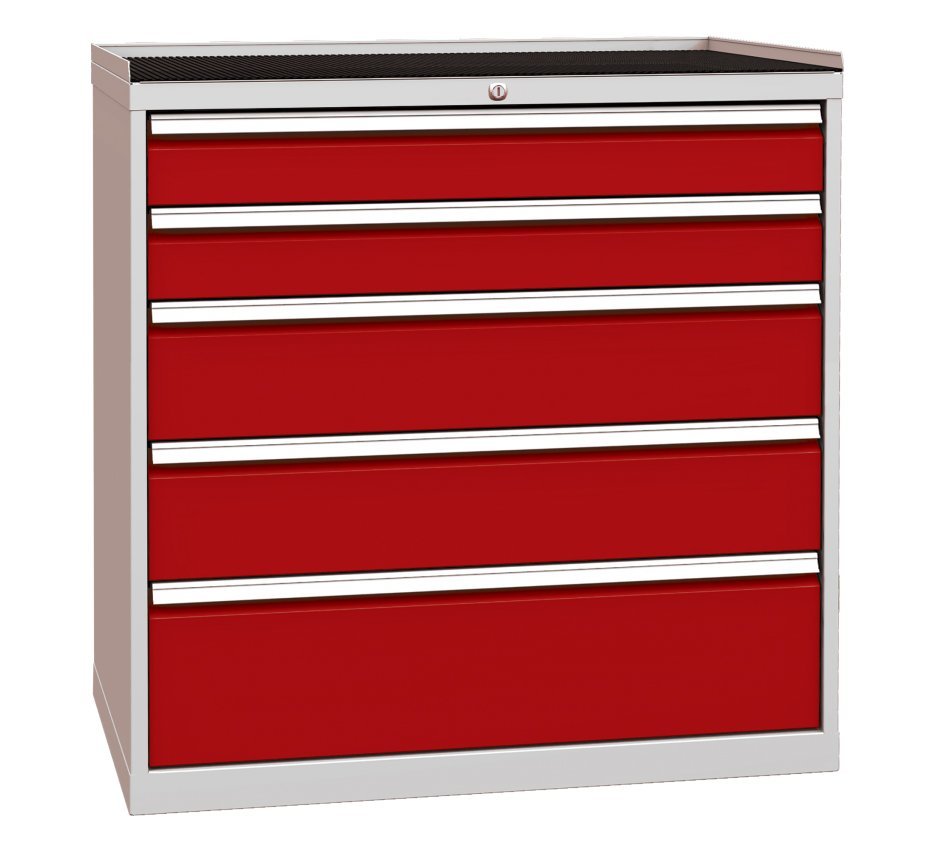 Päťzásuvková dielenská skriňa, šírka 1000, výška 1030, hĺbka 700 mm.Výsuv zásuviek 80%, nosnosť zásuviek 80 kg. centrálny zámok. 2x zásuvka 120, 2x 180, 1x 240 mm. Farba korpusu RAL 7035 svetlosivá.