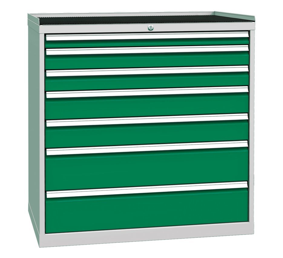 Sedemzásuvková dielenská skriňa, šírka 1000, výška 1030, hĺbka 700 mm. Výsuv zásuviek 80%, nosnosť zásuviek 80 kg. centrálny zámok.1x zásuvka 60, 2x 90, 2x 120, 2x 180 mm. Farba korpusu RAL 7035 svetlosivá.
