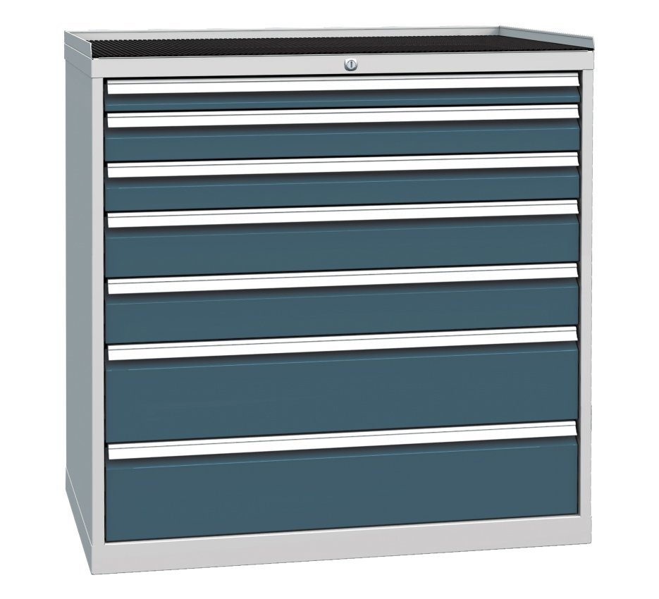 Sedemzásuvková dielenská skriňa, šírka 720, výška 1030, hĺbka 700 mm. Výsuv zásuviek 80%, nosnosť zásuviek 80 kg. centrálny zámok. 1x zásuvka 60, 2x 90, 1x 120, 2x 150, 1x 180 mm. Farba korpusu RAL 7035 svetlosivá.