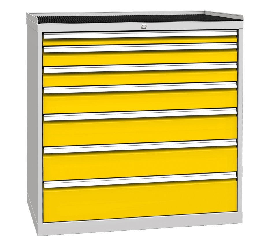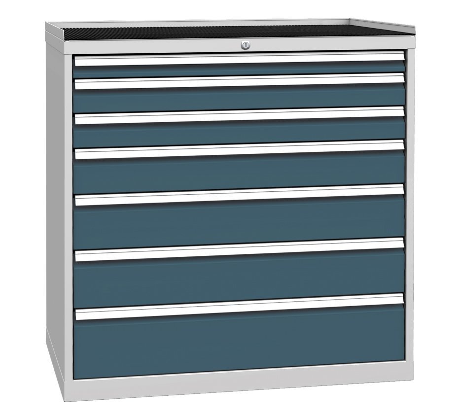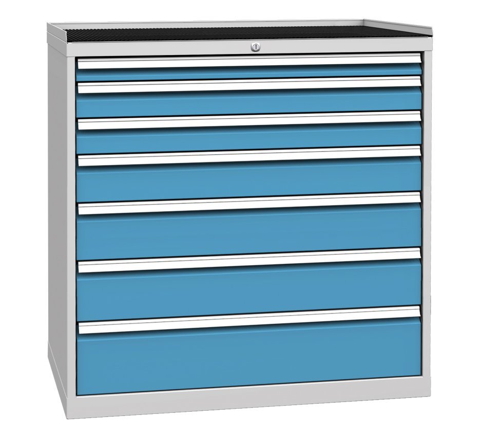 Sedemzásuvková dielenská skriňa, šírka 1000, výška 1030, hĺbka 700 mm. Výsuv zásuviek 80%, nosnosť zásuviek 80 kg. centrálny zámok. 1x zásuvka 60, 2x 90, 1x 120, 2x 150, 1x 180 mm. Farba korpusu RAL 7035 svetlosivá.