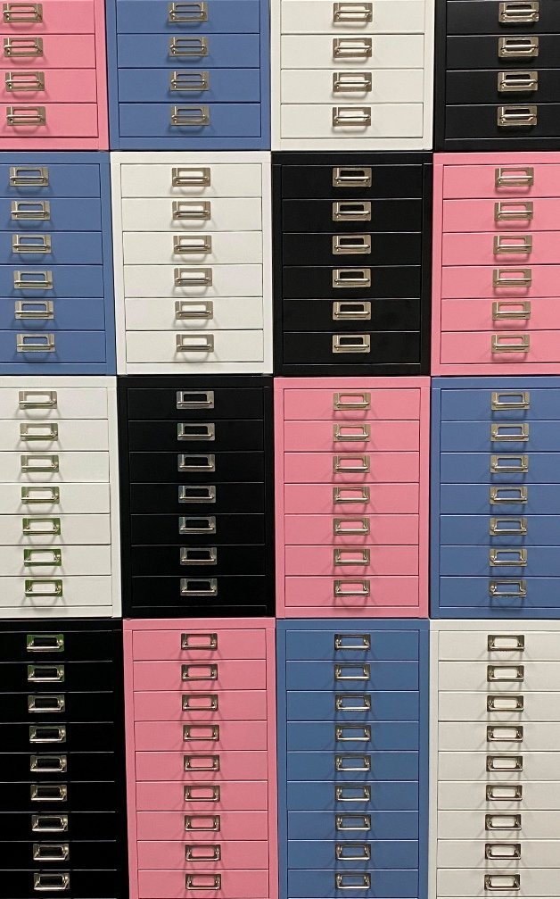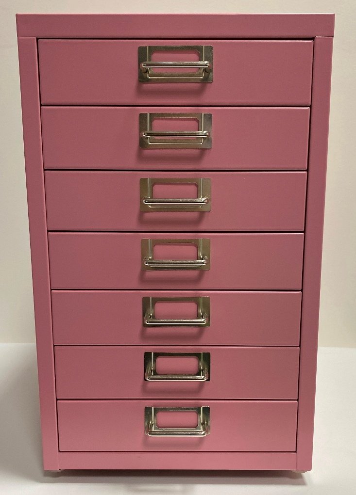 Jedenásť zásuvková kovová skrinka na kolieskach. Výška 695, šírka 280, hĺbka 380 mm. Pre formát A4, bez zámku, farba RAL 3015 ružová.
