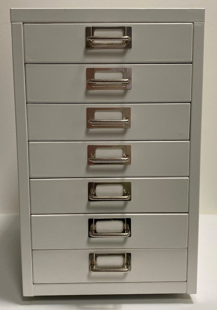 Sedemzásuvková kovová skrinka bez sokla. Výška 445, šírka 280, hĺbka 380 mm. Pre formát A4, bez zámku, rôzne farby. celý popis a parametre