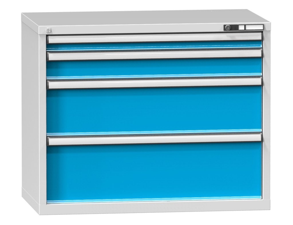 Zásuvková skrinka, 4x zásuvka, výška 840, šírka 1037, hĺbka 630 mm. Použitie do zostáv stolov s hĺbkou dosky 700 mm. Vnútorný rozmer zásuvky 918 x 459 mm.