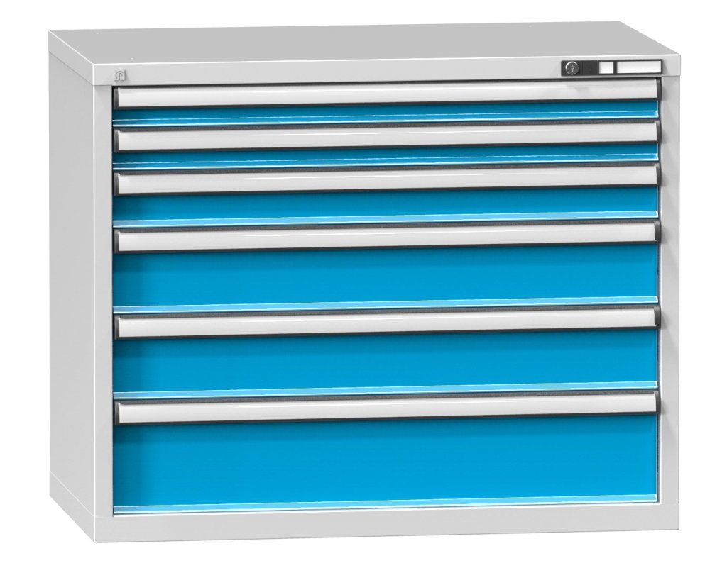 Zásuvková skrinka, 6x zásuvka, výška 840, šírka 1037, hĺbka 630 mm. Použitie do zostáv stolov s hĺbkou dosky 700 mm. Vnútorný rozmer zásuvky 918 x 459 mm.