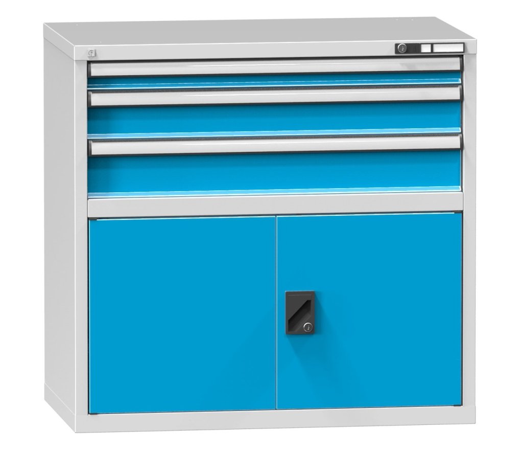 Zásuvková skrinka, 3x zásuvka, 1x dvierka + 1x prestaviteľná polica, výška 990, šírka 1037, hĺbka 630 mm. Vnútorný rozmer zásuvky 918 x 459 mm.