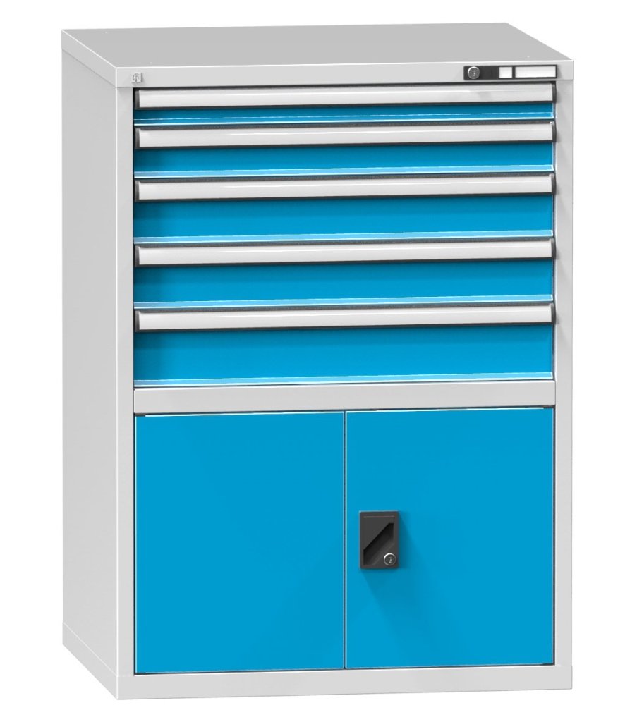 Zásuvková skrinka, 1x dvierka 550 mm + 1x staviteľná polica , 1x zásuvka 75E, 1x zásuvka 100E, 2x zásuvka 125E, 1x zásuvka 150E, výška 1215, šírka 884, hĺbka 780 mm. Vnútorný rozmer zásuvky 765 x 612 mm.