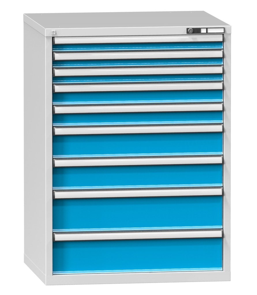 Zásuvková skrinka, 1x dvierka 550 mm + 1x staviteľná polica , 1x zásuvka 75E, 1x zásuvka 100E, 2x zásuvka 125E, 1x zásuvka 150E, výška 1215, šírka 884, hĺbka 780 mm. Vnútorný rozmer zásuvky 765 x 612 mm.