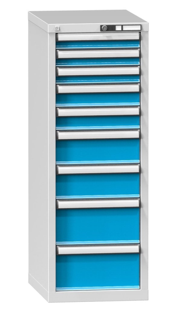 Zásuvková skrinka, 1x dvierka 550 mm + 1x staviteľná polica , 1x zásuvka 75E, 1x zásuvka 100E, 2x zásuvka 125E a 1x zásuvka 150E, výška 1215, šírka 442, hĺbka 630 mm. Vnútorný rozmer zásuvky 323 x 459 mm.