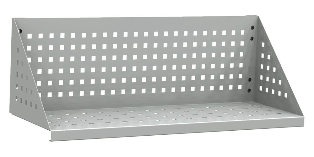 Závesná kovová polica, farba strieborná RAL 9006. Výška 318 x šírka 1000 x hĺbka 315 mm. Nosnosť police 40 kg.