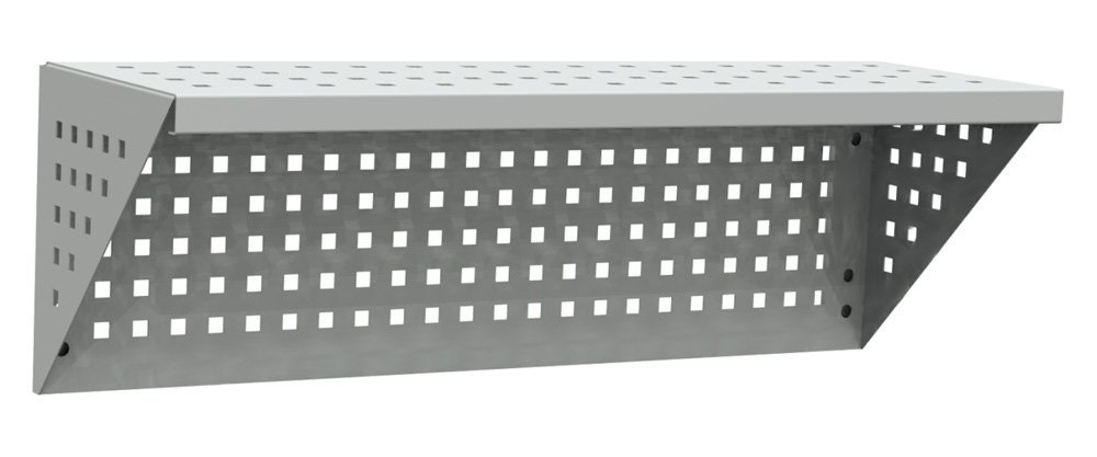 Závesná kovová polica, farba strieborná RAL 9006. Výška 318 x šírka 1000 x hĺbka 315 mm. Nosnosť police 40 kg.