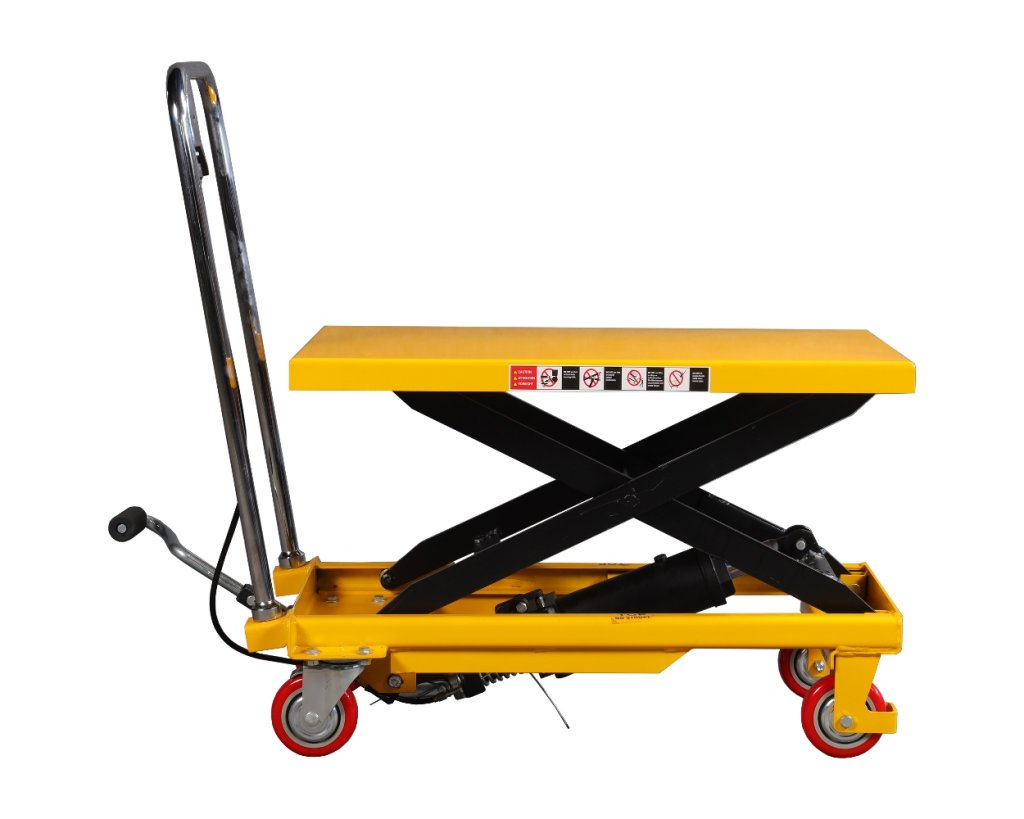 Zdvíhacia nožnicová plošina vybavená nožným hydraulickým čerpadlom s nosnosťou 500 kg a maximálnym zdvihom 900 mm.