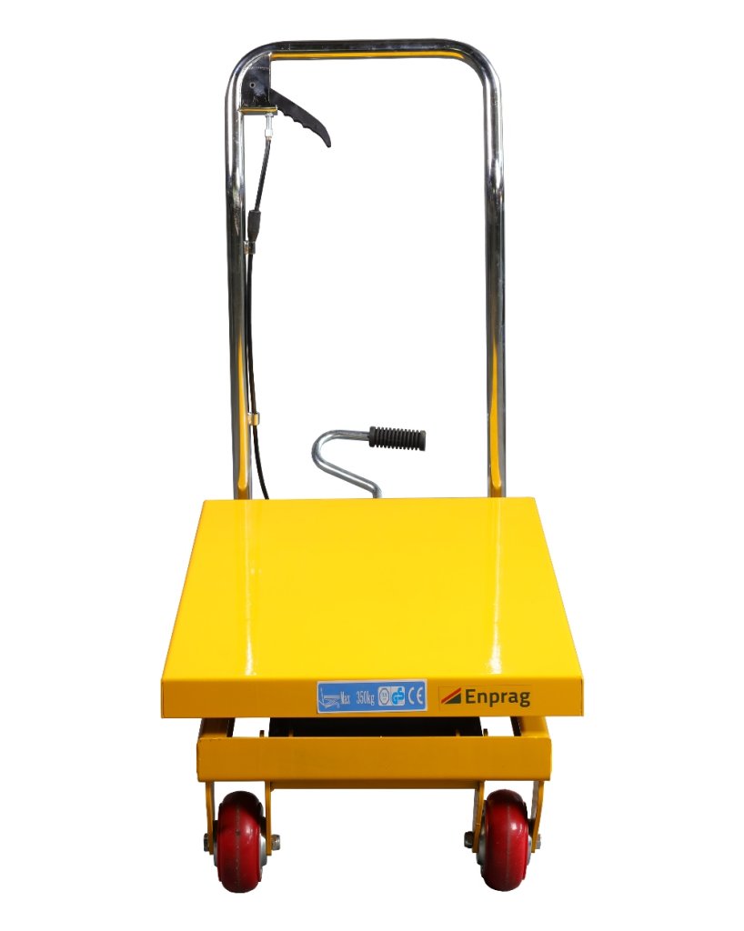 Zdvíhacia nožnicová plošina vybavená nožným hydraulickým čerpadlom s nosnosťou 350 kg a maximálnym zdvihom 900 mm. celý popis a parametre