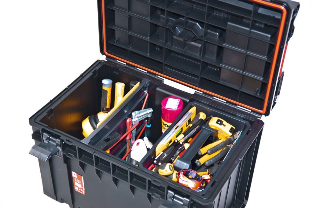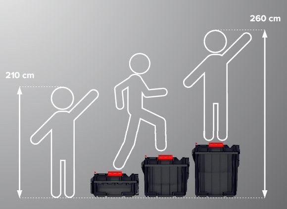 Mobilná zostava 3 kufrov na náradie a podvozku. Rozmer celej zostavy výška 1020, šírka 745, hĺbka 510 mm. Kufre aj podvozok sú vybavené istiacim mechanizmom pre bezpečné stohovanie kufrov aj následnú manipuláciu. Vyrobené z technického polyamidu čím je zaistená vysoká odolnosť proti poškodeniu. Madlá, zámky a istiace mechanizmy sú zvlášť odolné proti poškodeniu či ulomenie. Jednotlivé kufre bez podvozku možno použiť ako stupienok.