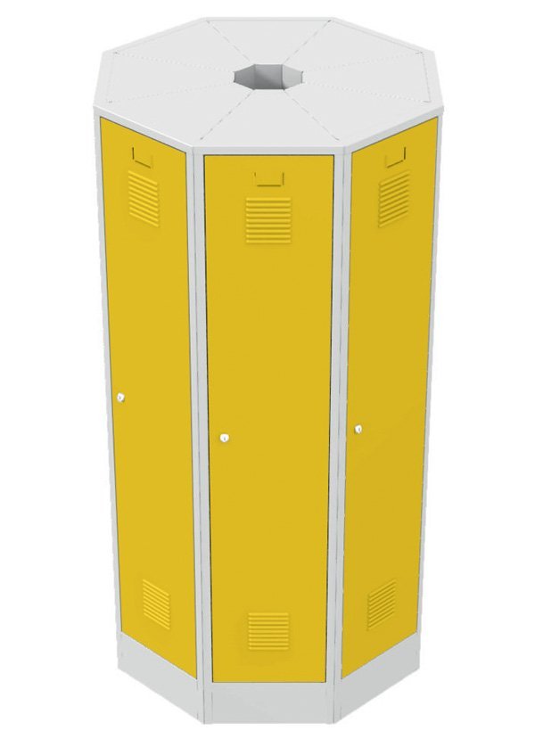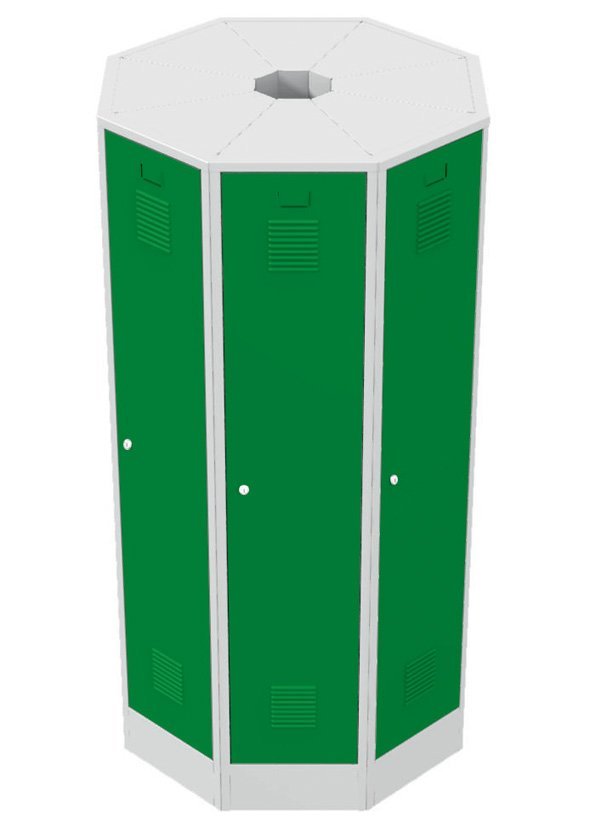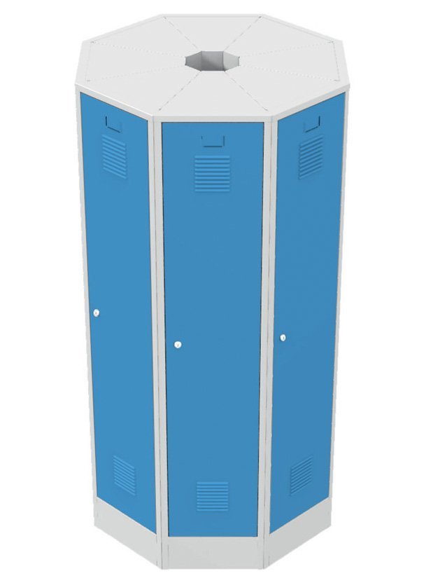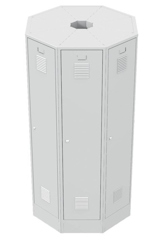 Zostava 8 ks trojuholníkových skríň RAS určených k zmontovaniu do samostatného kruhového bloku. Výhodou je veľký počet šatníkových oddielov (8 ks) v samostatnom monolitu, ktorý je určený k inštalácii do priestoru. Výška 1850 x šírka 1000 x hĺbka 1000 mm. Farba korpusu RAL 7035 svetlosivá.